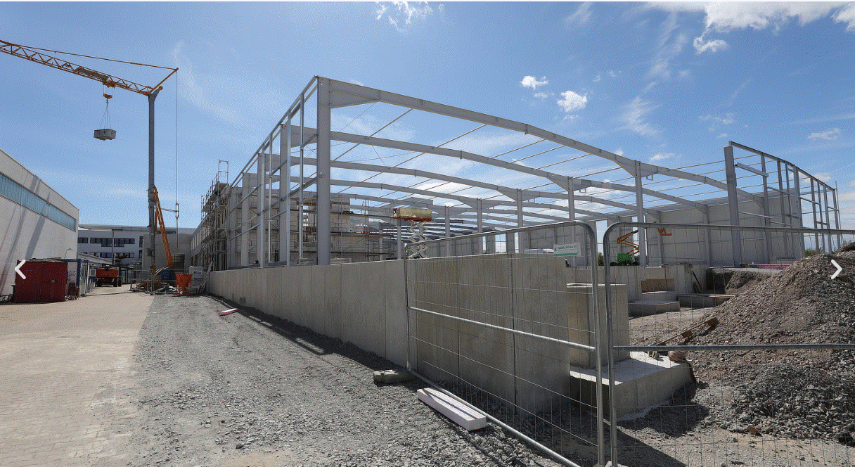 新工場の建設は、はっきりと形になりつつあります。すべての支柱が所定の位置にあり、屋根桁が設置され、中央に位置する頑丈な構造のシェルが完成しました。屋根と外壁が完全に閉じられるのにそれほど時間はかかりません。